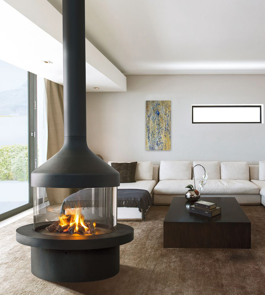 La cheminée gaz Meijifocus est un modèle central, vitré qui peut être posé directement au sol, sur un socle en acier ou sur un socle en maçonnerie.