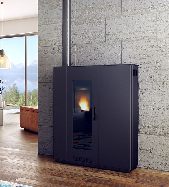 Le poêle à granulés de bois Jøtul PF 710, avec une puissance de chauffe de 7 kW et une sortie sur le dessus.